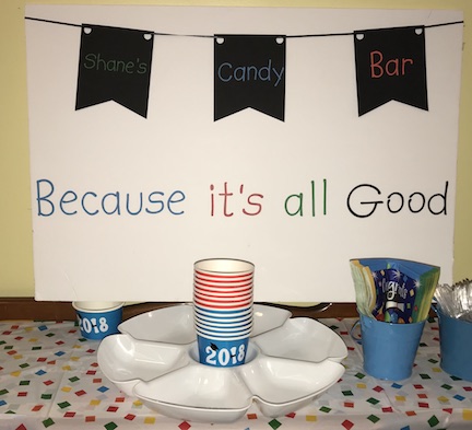 This fun candy bar is themed for the Pete the Cat Preschool Graduation Party. An easy way to create a backdrop for a candy bar is to use a foam board from the dollar tree and add decorations. I love how Pete’s saying is perfect for the candy bar and the party “because it’s all good.” The banner and saying were created with my Cricut Maker, but you can use a printable banner, buy a banner or create your own. Here’s a tutorial on how to create a banner using the Cricut.