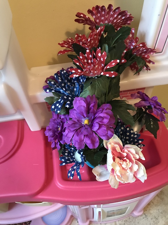 Another fun idea is to take the flowers and create a flower shop to play in. The kids love to create a flower shop in the kitchen play center and display their flower arrangements.