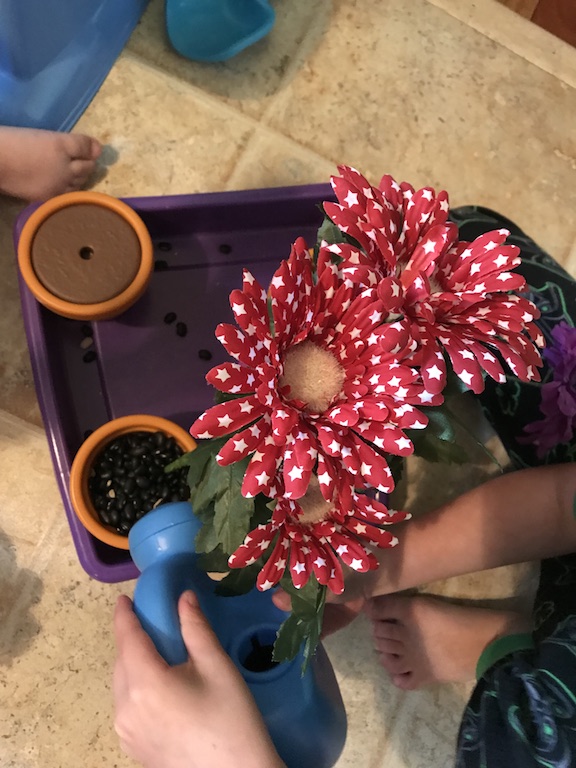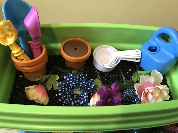 The kids can spend hours scooping, planting, and creating a rainbow. I love listening to their stories as they create and plant a garden. The cutest is when they create presents for each other with the flowers.