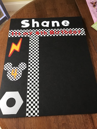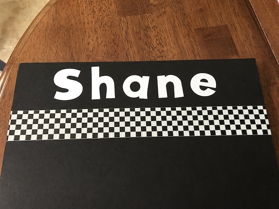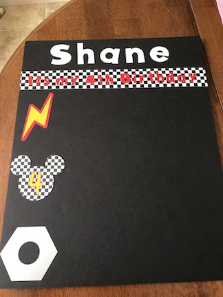 Step 7: I added “I Love” to the top of the board under the duct tape divider. I used the Disney Mickey End Caps Font (I also used it for Shane’s name) and the letters are not straight. The letters have that goofy Mickey twist to them, so they are not crooked, it’s just how they are (the letters drove me a little crazy). I also added the checkered flags with the Mickey ears at the bottom of the board so that I knew exactly how much space I had for the information of everything my son loves.
