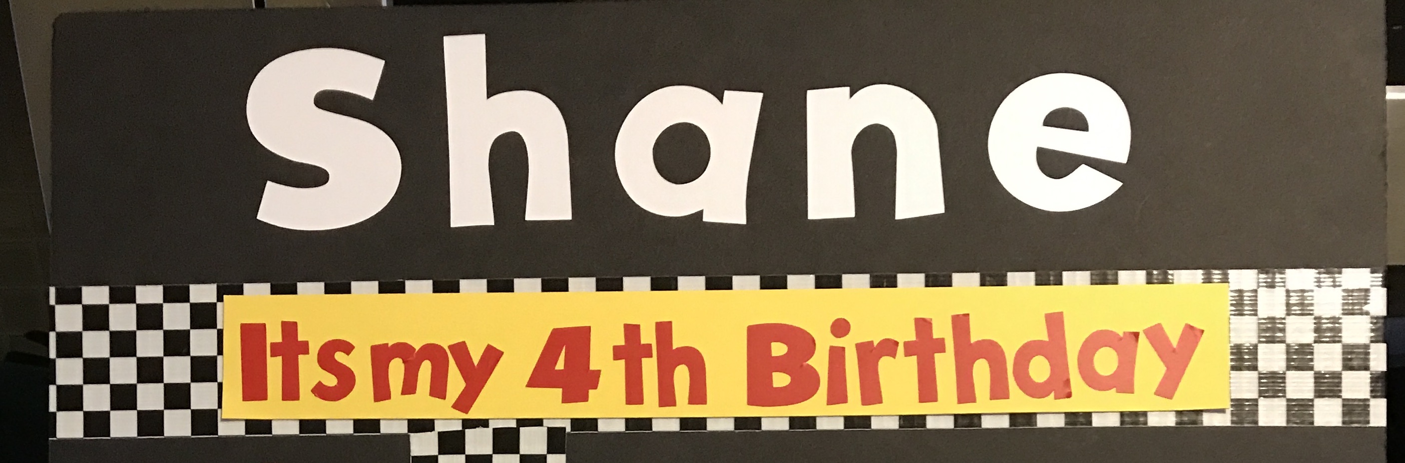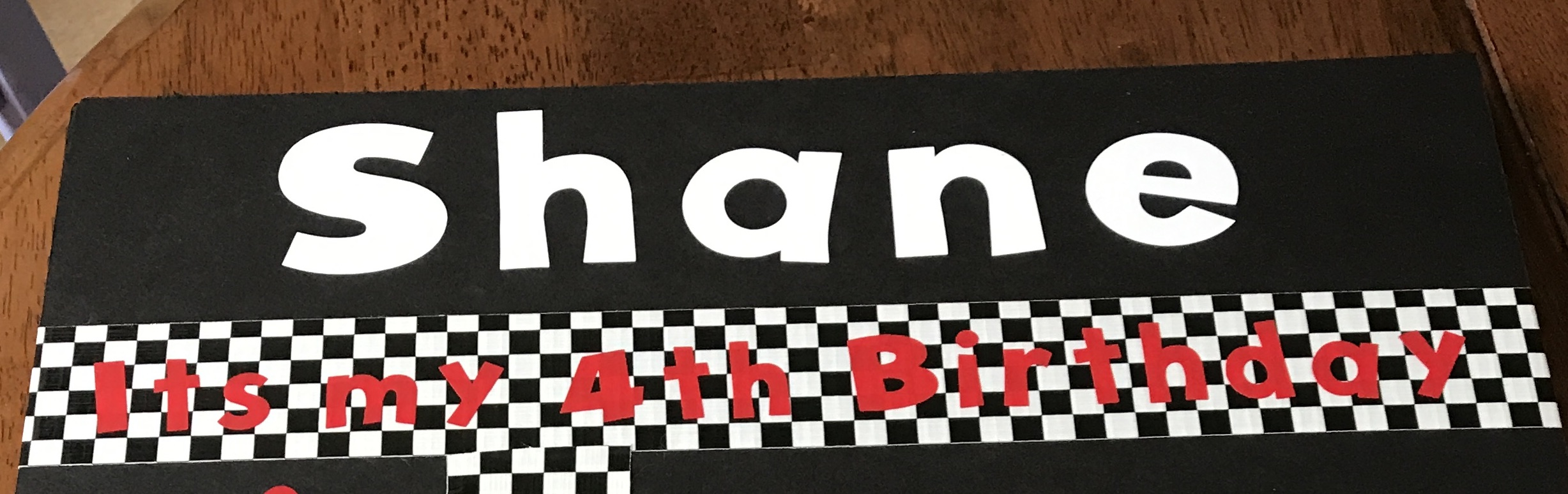 Step 4: I added “It’s my 4th Birthday” the vinyl was hard to read on the checkered flag duct tape, so I ended up peeling off the vinyl and putting it onto yellow cardstock, then I glued the cardstock on top of the duct tape. Picture 1 shows the red vinyl and picture 2 shows the letters on the cardstock, which is easier to read.