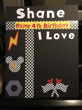 Here is another fun idea for a Mickey and the Roadster Racer Birthday Party, which is a birthday board. I had creative block (like writers block), I just couldn’t visualize the board. Last year my son’s birthday theme was Mickey Mouse, so I didn’t want it anything like his board from last year. I also wanted the board to match the other birthday decorations. I just decided to start making it (I was out of time) and my creativity started flowing when I started the board.