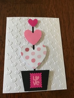 For my daughter I made her a heart topiary card because it was adorable just like her. I made 3 hearts, one small, one medium, and one large. Then I made a skinny rectangle to use as the pole and added the flower pot. On the flower pot I put on the love postage stamp.