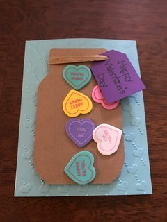 I wanted to make a card for the Grandparents, Aunts and Uncles and teachers that my children would also be able to help me with because our family all love cards made by the little munchkins and I’m sure the teachers do to. So I did a mason jar on plain brown paper and I bought foam conversation heart stickers from Target for the munchkins to decorate the mason jars with. I added a Happy Valentine’s Day tag and of course embossed the paper behind the mason jar. I matched the background paper to the colors of the foam conversation hearts.